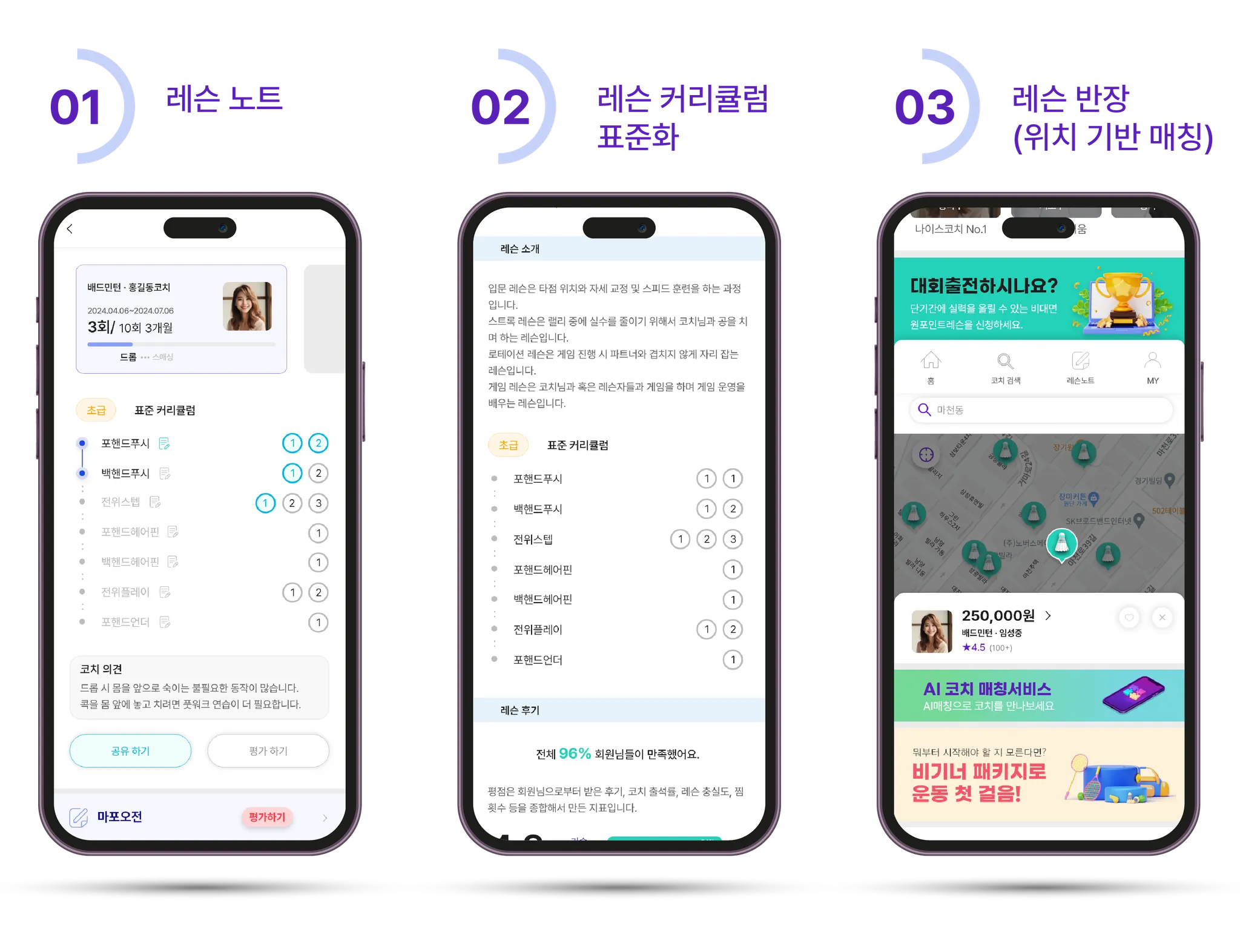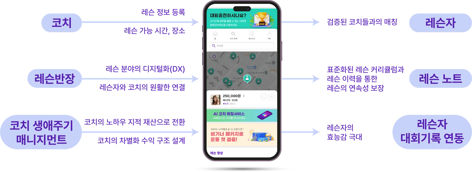 나이스코치는 국내 최초 디지털 커리큘럼 레슨 노트와 레슨자 대회기록과 연계된 생활체육 지도자 AI매칭 서비스를 제공합니다.